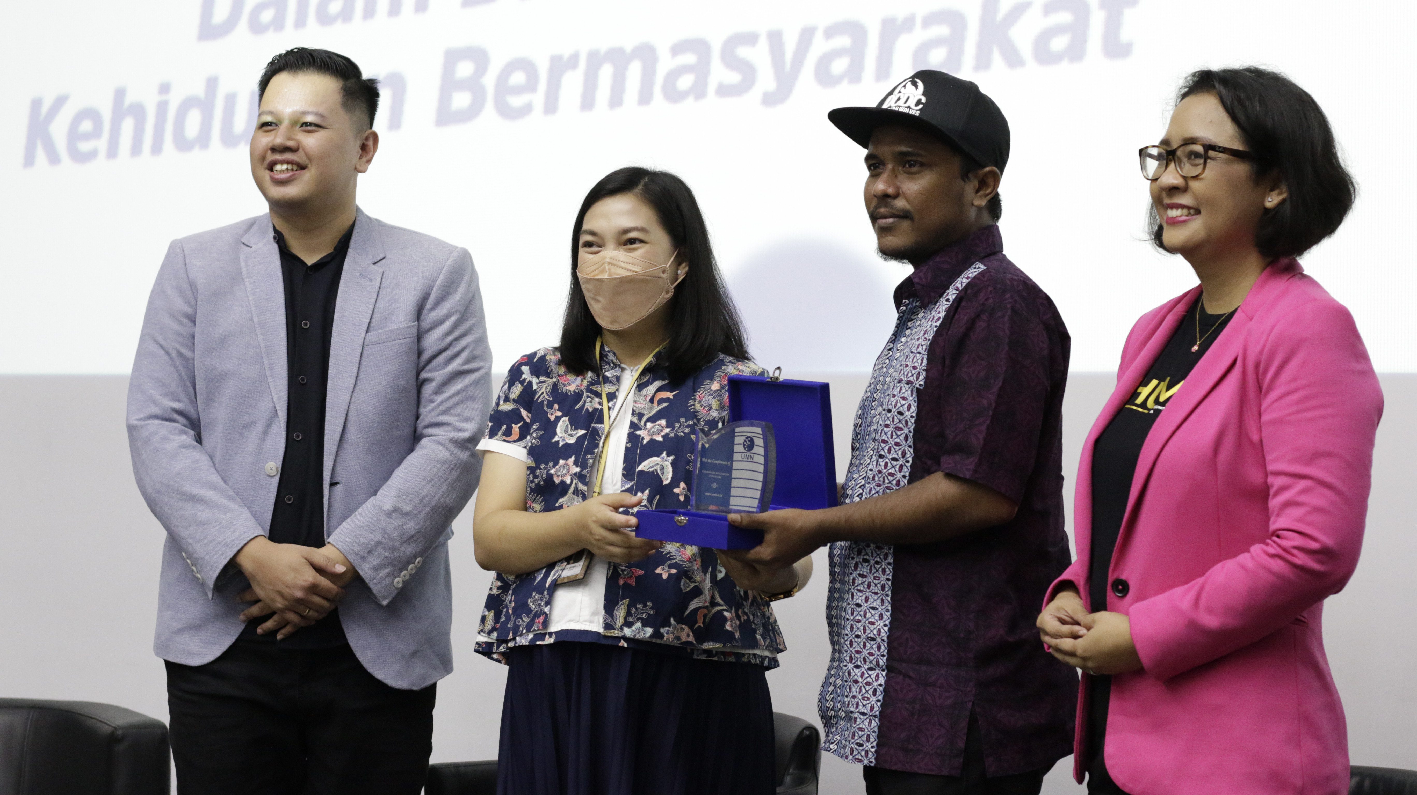 Ketua Program Studi PJJ Ilmu Komunikasi Helga Liliani C. D. (kiri ke-2) menyerahkan plakat kepada narasumber “Diskusi Humor dalam Dinamika Kehidupan Bermasyarakat”, antara lain Silvanus Alvin (paling kiri), Mamat Alkatiri (kiri ke-3), Novrita Widiyastuti (paling kanan). (dok. UMN)