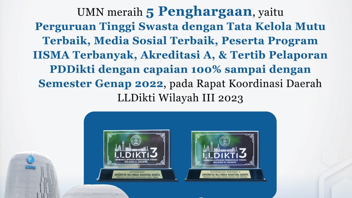 Tangerang (21/3) – Universitas Multimedia Nusantara kembali menorehkan prestasi. Prestasi kali ini diraih pada Rapat Koordinasi Daerah (Rakorda) LLDikti Wilayah III 2023 dengan tema “Merdeka Belajar Kampus Merdeka: Terobosan Berani Yang Penuh Arti”. Pada Rakorda kali ini, UMN mendapatkan 5 penghargaan yaitu Perguruan Tinggi Swasta dengan Tata Kelola Mutu Terbaik, Perguruan Tinggi Swasta dengan Media Sosial Terbaik, Perguruan Tinggi Swasta Peserta Program IISMA Terbanyak, Perguruan Tinggi Swasta dengan Akreditasi A, Perguruan Tinggi Swasta Tertib Pelaporan PDDikti dengan capaian 100% sampai dengan Semester Genap 2022.