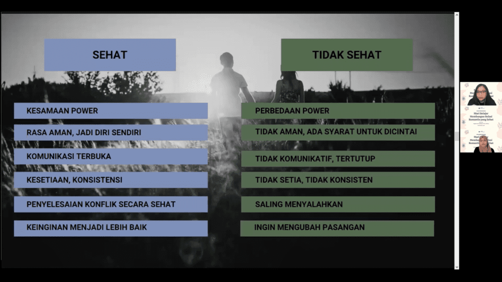 Selama kurang lebih satu jam, Anggita menyampaikan materi webinar secara mendetail. Materi dibahas mulai dari membangun hubungan romantis yang sehat hingga mengenal kekerasan dalam hubungan romantis. Di akhir sesi, Anggita juga membuka kesempatan diskusi mendalam dengan peserta webinar.