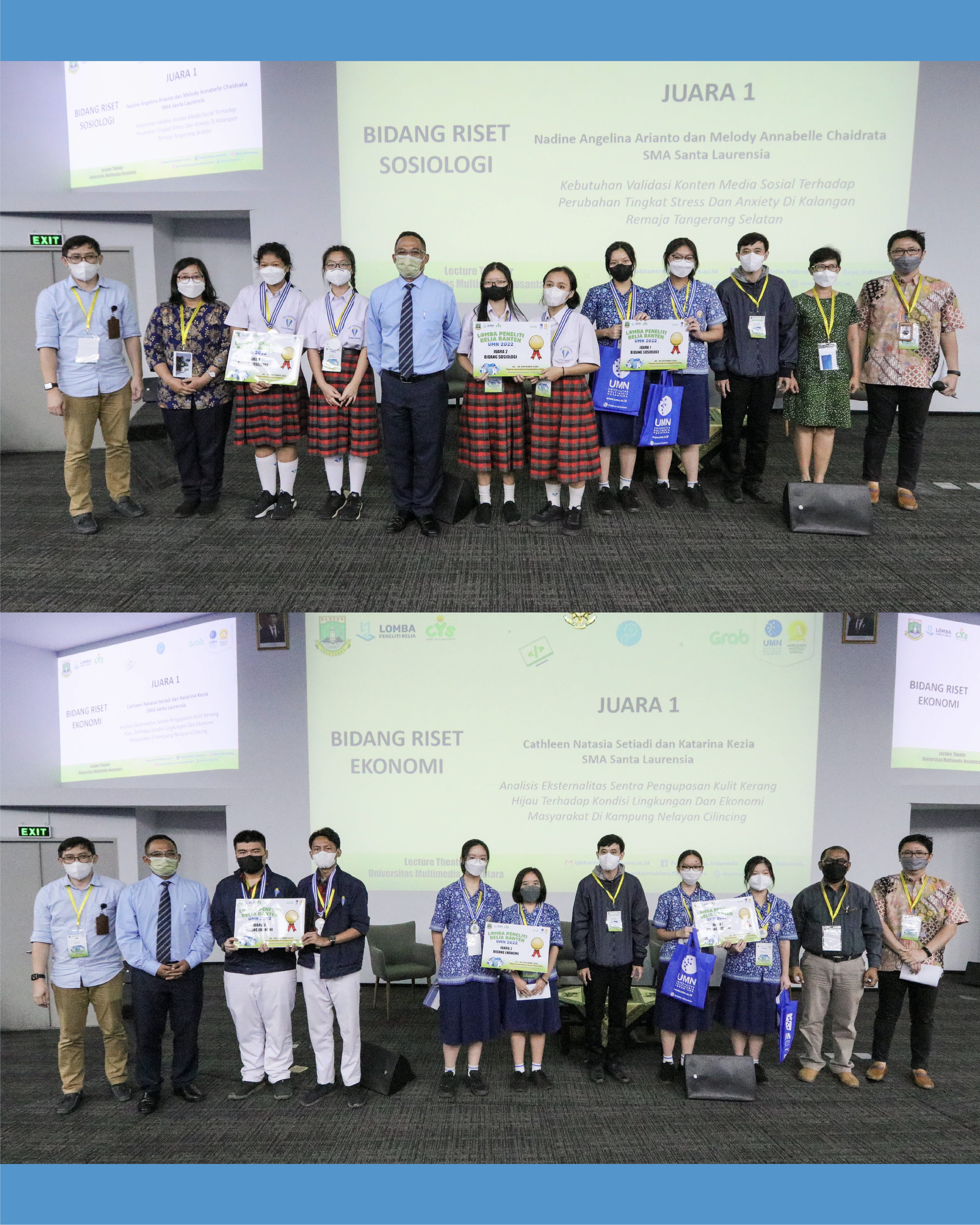 Juara 1: Nadine Angelina Arianto dan Melody Annabelle Chaidrata dari SMA Santa Laurensia tentang “Kebutuhan Validasi Konten Media Sosial terhadap Perubahan Tingkat Stress dan Anxiety di Kalangan Remaja Tangerang Selatan”.