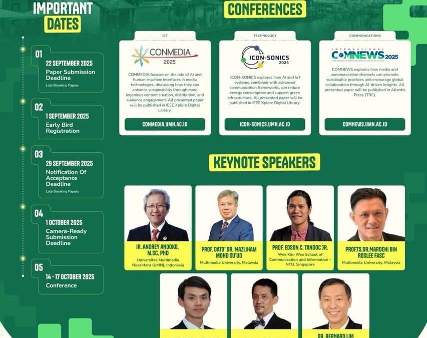 Malaka, Malaysia (9/10/2025) – Konferensi internasional CIC 2025 Joint Conference akan segera digelar pada 14–17 Oktober 2025 di Multimedia University (MMU), Malaka, Malaysia, menghadirkan kolaborasi akademik lintas negara melalui format hibrida (on-site dan online). Kegiatan ini diselenggarakan oleh Universitas Multimedia Nusantara (UMN) bersama Multimedia University (MMU) sebagai tuan rumah, dan menggabungkan tiga konferensi unggulan: 8th CONMEDIA, 4th ICON-SONICS, serta 5th COMNEWS.