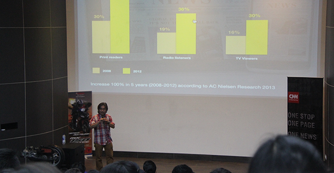 Universitas Multimedia Nusantara (UMN) pun mempersiapkan anak didiknya yang akan terjun dalam bidang jurnalistik dengan berbagai “amunisi”. Salah satunya adalah dengan mendatangkan pakar-pakar yang memang ahli di bidangnya. Kali ini, lewat acara CNN Indonesia Goes to Campus with Yamaha pada Kamis (30/4), UMN mendapat kesempatan untuk mendengarkan sharing dari Yusuf Arifin, Pemimpin Redaksi CNN Indonesia dan juga salah satu pendiri Detik.com.
