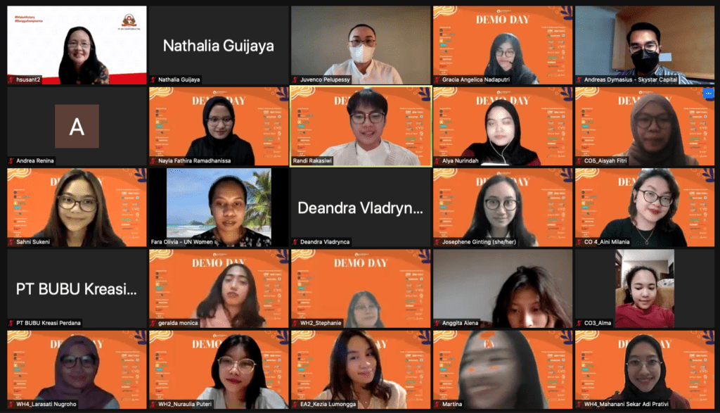 Jakarta, 29 November 2021 – BUBU.COM dan Skystar Ventures UMN sukses menutup program inkubasi Super Girls In Tech dengan rangkaian acara terakhir, yaitu Demo Day. Terdapat 20 kelompok peserta yang sudah melalui tahap inkubasi selama empat bulan dan siap mempresentasikan prototype bisnis kepada para panelis. Secara langsung peserta akan mendapatkan saran dari para panelis, yaitu Andreas Dymasius Sitorus (Senior Investment Associate at Skystar Capital), Juvenco Pelupessy (Principal at Skystar Capital), Shinta Witoyo Dhanuwardoyo (CEO BUBU.COM), Faransina Olivia Rumere (Project Manager, Consultant, and Data Analyst), dan Henny Susanto (Head of Zone Jakarta at PT HM Sampoerna Tbk).