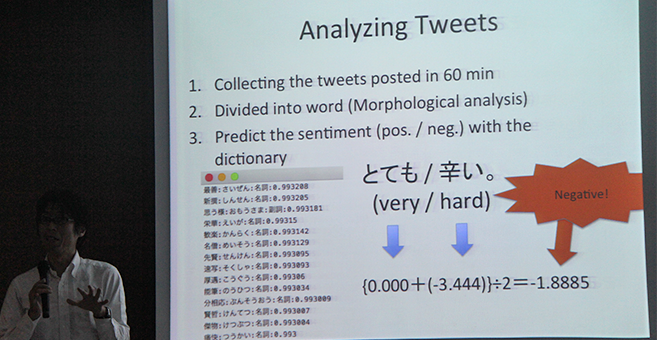 Dalam seminar yang sama, Taketoshi Ushiama, Associate Professor dari Kyushu University juga memberikan sebuah contoh nyata tentang sebuah produk IMD yang mempermudah para social media specialist mengetahui apakah sebuah topik yang sedang hangat dibincangkan di Twitter bernada negatif atau positif. Nama produk tersebut ada Feeling Elevator.