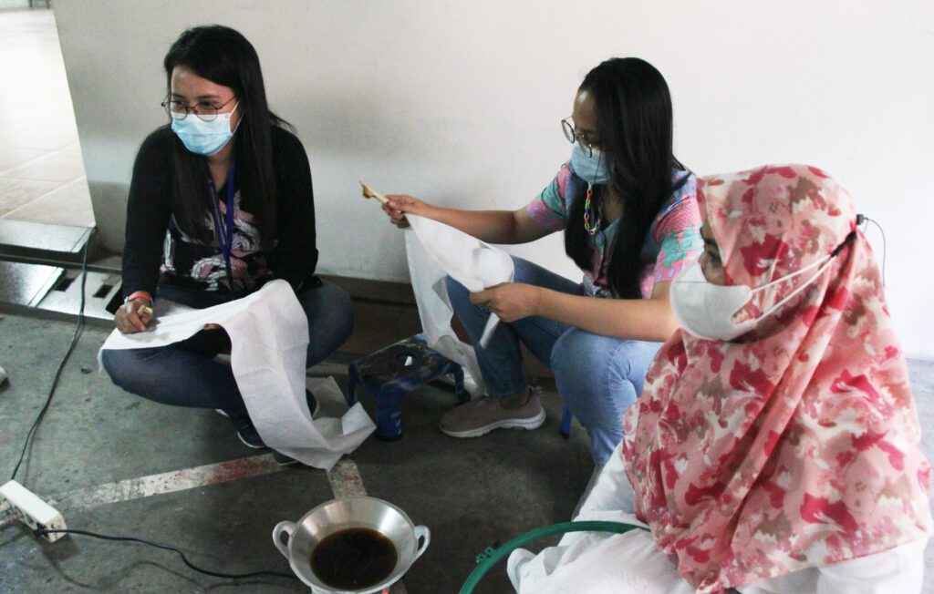 Ketua Pelaksana Acara Fenina Adline Twince Tobing, S.Kom., M.Kom. beserta dosen UMN lainnya mencanting batik dengan salah satu peserta acara (dok. UMN).