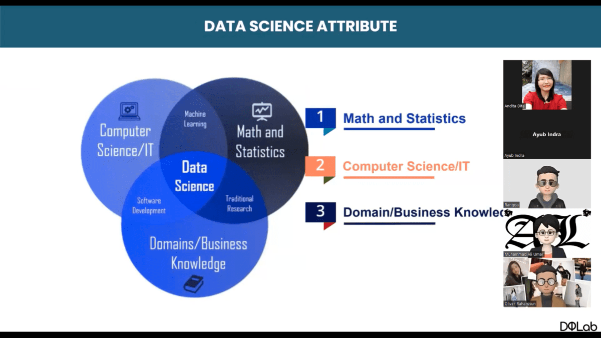 Melalui penjelasannya, Ayub juga memberikan sebuah perumpamaan yang mudah untuk dipahami oleh teman-teman peserta tentang paradigma Data Science. Data Science sendiri merupakan gabungan dari berbagai macam disiplin ilmu, terutama komputer sains dan statistik. Kedua ilmu tersebut sudah pasti dipelajari oleh seluruh jurusan, seperti statistik digunakan untuk mengolah data dan kemudian teknologi informasi dimana mahasiswa diajarkan penggunaan software seperti Microsoft Excel.”Jadi buat temen-temen yang backgroundnya tidak asli dari dua disiplin ilmu ini, opportunitynya sangat besar banget. Karena (kita) punya domain knowledge yang kita bangun sendiri” kata Ayub.