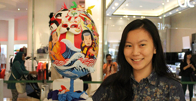 April 16, 2015Telur-telur cantik hasil karya Oessella Benawar (Desain Grafis 2011) ini berhasil memenangkan dua kontes yang berbeda di Central Park Mall dan Summarecon Digital Center (SDC). Telur dengan konsep ‘Beautifully Japan’ meraih juara favorit pada ajang Eggster Design Competition Central Park, sedangkan telur berilustrasikan keceriaan anak-anak untuk lomba di SDC dinobatkan sebagai juara pertama.