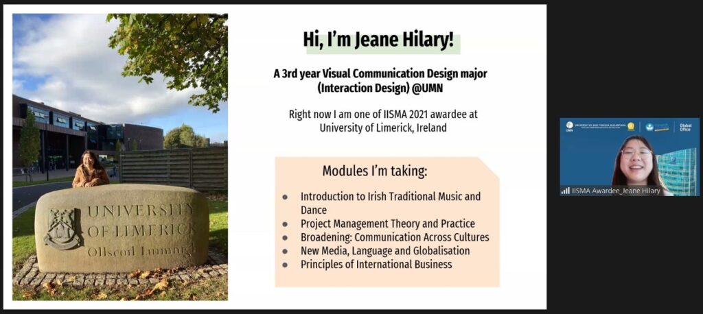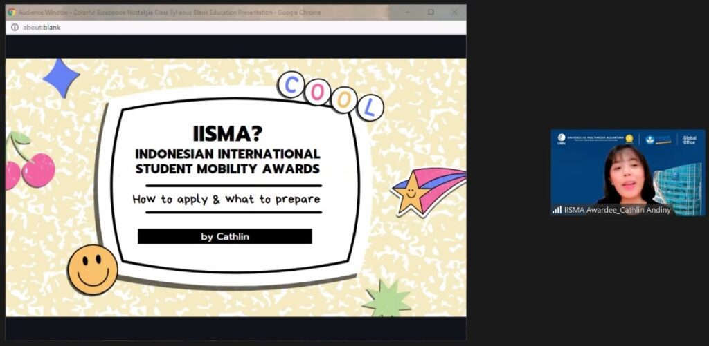 TANGERANG – Indonesian International Student Mobility Awards (IISMA) merupakan program beasiswa dari Kemendikbud untuk mendanai mahasiswa Indonesia yang akan melanjutkan kuliah di universitas luar negeri. Telah mengirimkan 1000 mahasiswa dari berbagai universitas ternama di Indonesia, dua diantaranya adalah mahasiswa dari Universitas Multimedia Nusantara (UMN). Acara yang difasilitasi Global Office UMN diadakan secara daring, Senin 8 November 2021.