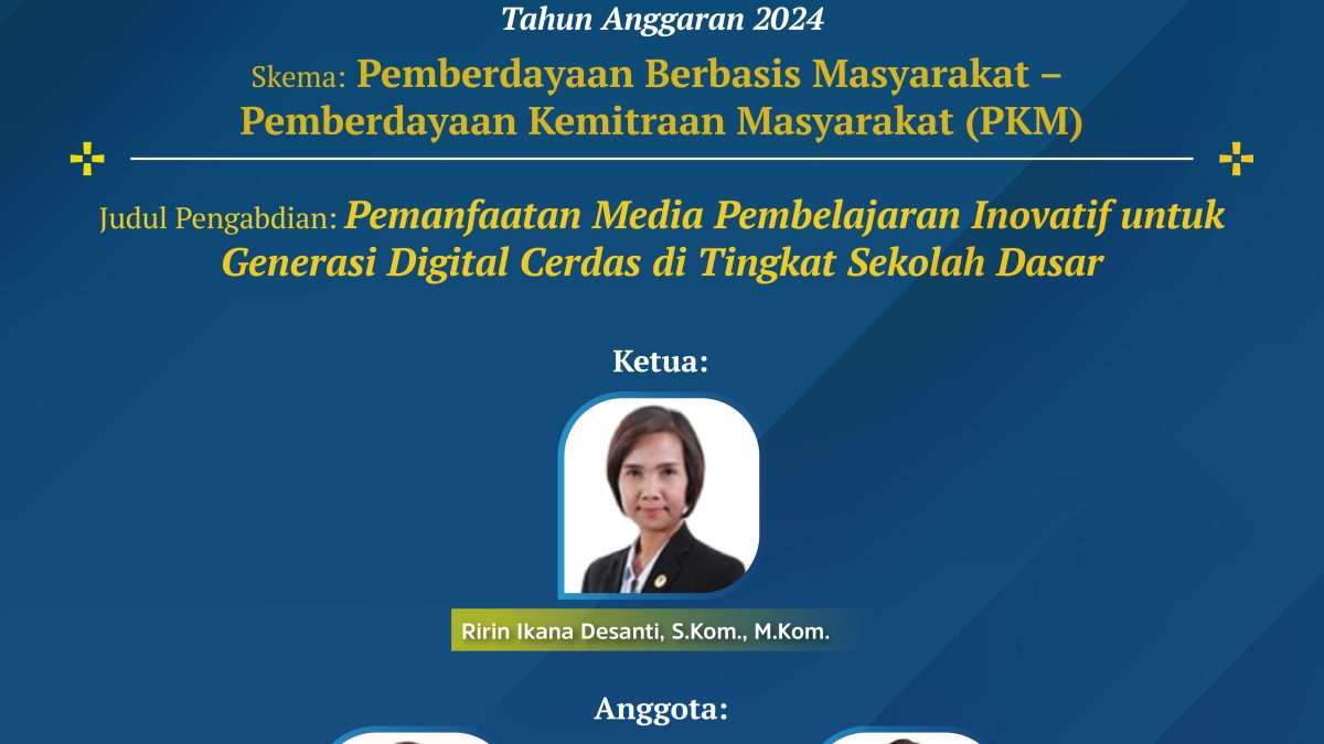 Salah satu proposal yang lolos pendanaan program PKM ini berjudul “Pemanfaatan Media Pembelajaran Inovatif untuk Generasi Digital Cerdas di Tingkat Sekolah Dasar”. Proposal ini digarap oleh Kaprodi Sistem Informasi UMN Ririn Ikana Desanti, S.Kom., M.Kom.; Sekprodi Teknik Komputer UMN Dareen Kusuma Halim, S.Kom., M.Eng.Sc.; dan Sekprodi Sistem Informasi UMN Suryasari, S.Kom., M.T..