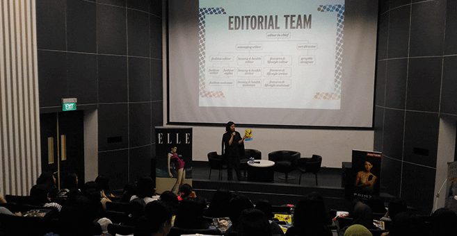 Dalam seminar tersebut, ELLE menghadirkan Fashion Editor Erika Tania Dessyandra sebagai pembicara. Ia menjelaskan struktur dunia jurnalistik di majalahnya yang berkantor di Jakarta Selatan ini.