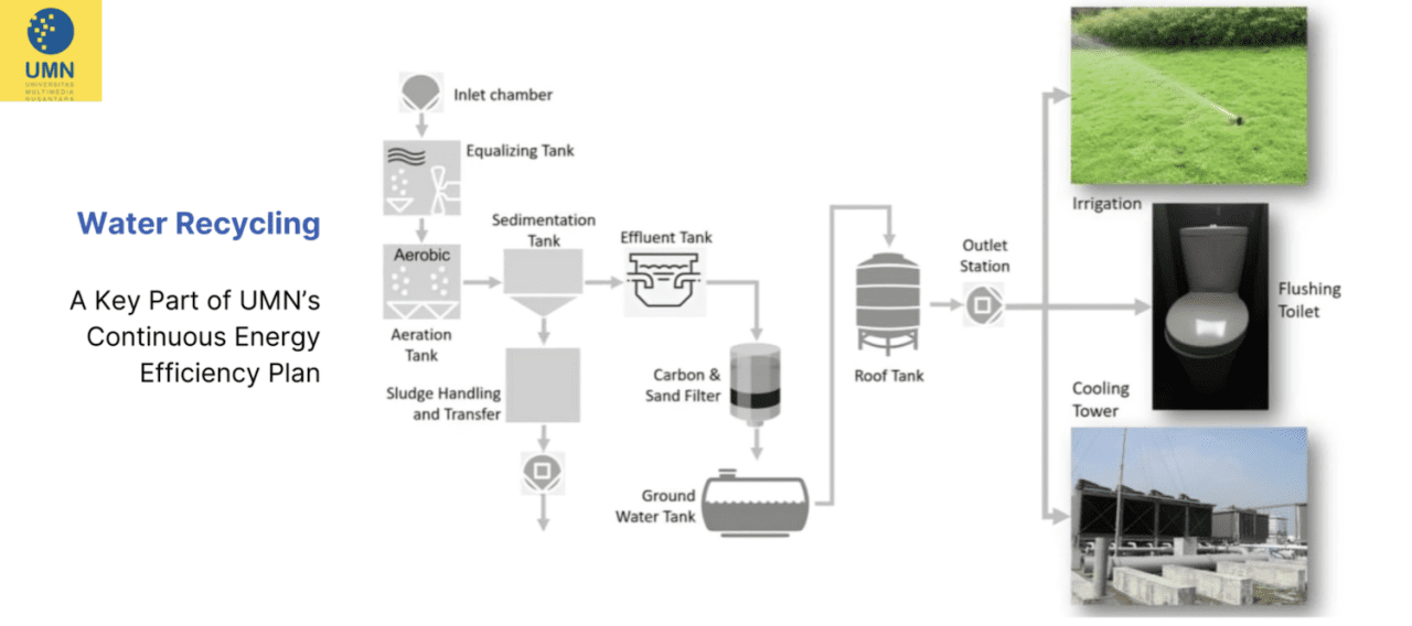 UMN also integrates water management into its energy efficiency plan by recycling greywater. Wastewater from the New Media Tower and PK Ojong – Jakob Oetama Tower undergoes treatment through a Sewage Treatment Plant (STP) using aerobic bacteria that break down impurities. After treatment, the water is further processed in a Water Treatment Plant (WTP) and reused 100% for irrigation, toilet flushing, and cooling towers in the air conditioning system. This recycling reduces the need for freshwater pumping and heating, ultimately decreasing energy consumption across campus operations.