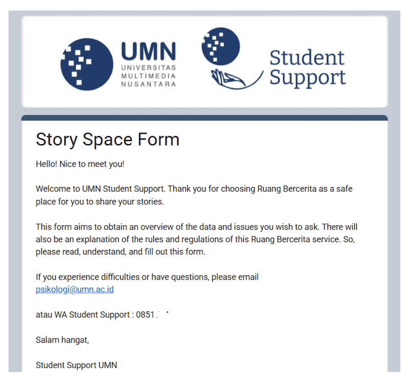 Ruang Berkisah is an online counseling access point provided by UMN Student Support, allowing students to confidentially share their concerns and seek psychological assistance from professional counselors. Through this platform, students can submit their issues and arrange counseling support in a safe and supportive environment.