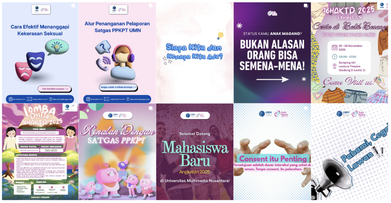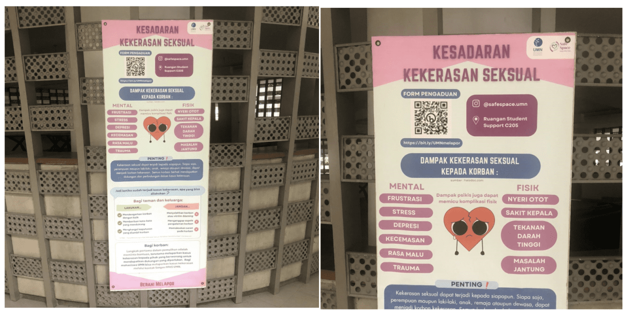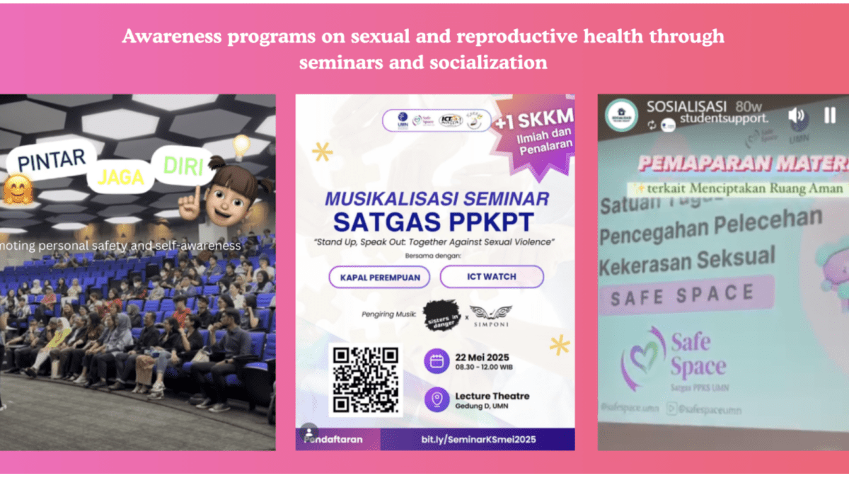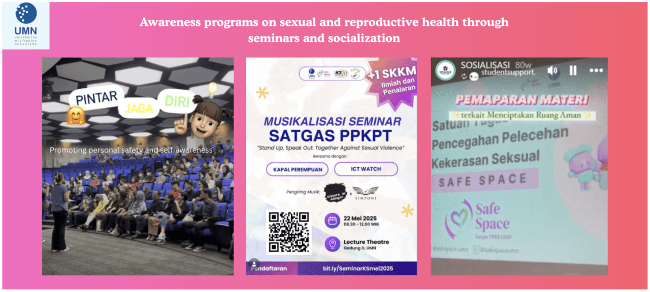 Universitas Multimedia Nusantara (UMN) is committed to creating a safe and respectful campus environment by providing access to information, support services, and reporting mechanisms related to sexual and reproductive health and the prevention of sexual violence. These efforts are coordinated through the Satuan Tugas Pencegahan dan Penanganan Kekerasan di Perguruan Tinggi (Satgas PPKPT), also known as Safe Space UMN, which works to ensure that the university community is protected from all forms of sexual harassment, gender-based violence, and other forms of violence on campus.