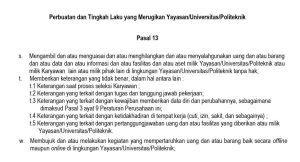 Furthermore, employees are prohibited from engaging in activities that may harm the university, including providing false financial reports related to funds or facilities (Article 13, Section 3, Subsections s and t). The regulations also ban participation in gambling activities, whether conducted offline or online, within the university environment (Article 13, Section 3, Subsection w).