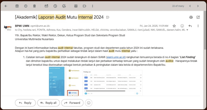 February 10, 2025Our institution shares the decisions made during the annual Management Review internally. The meeting minutes and supporting evidence of activities are distributed via email and stored on OneDrive, accessible to all academic staff. At the beginning of each year, audit results are disseminated to review the findings from the previous year. This process is essential to ensure sustainable progress at UMN.