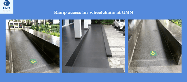 At UMN, inclusivity is one of our core values that ensures equal access for everyone. We are committed to creating an accessible environment for all individuals, including those with disabilities. In accordance with Ministry Regulation Number 30/PRT/M/2006, the “Technical Guidelines for Facilities and Accessibility,” UMN offers a variety of services and facilities designed to meet the needs of people with disabilities. These include guide blocks for the visually impaired, Braille buttons in all lifts, wheelchair-accessible ramps at building entrances and between buildings, special toilets on each floor, and designated parking spaces for disability vehicles. Our goal is to provide a campus that is both welcoming and accessible to all.