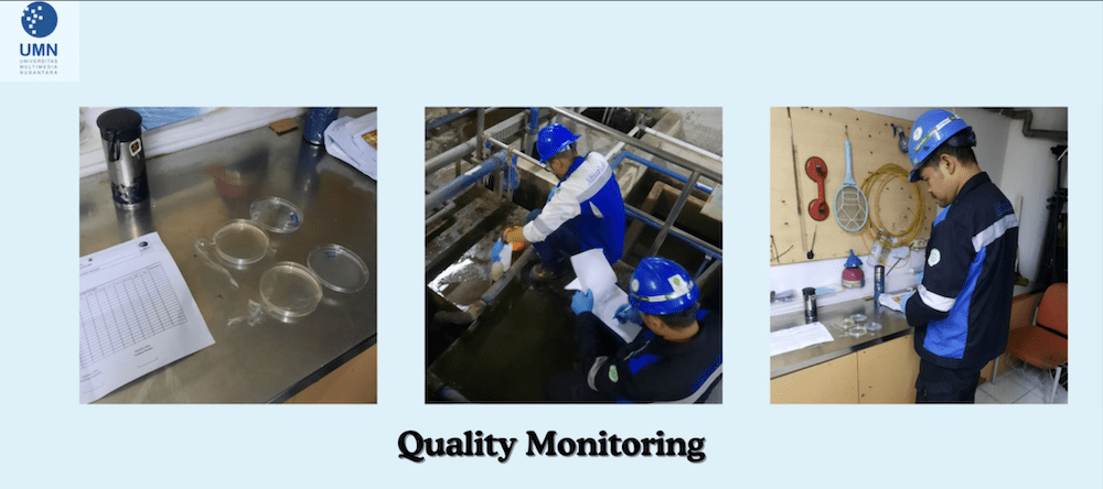 To further support this system, UMN conducts routine water quality monitoring through both its internal technical team and certified external laboratories. Daily checks are carried out to ensure the functional performance of critical STP and WTP components, including aerators, water levels, and stability of aerobic bacteria populations. In addition, scheduled laboratory analyses of wastewater samples are performed to evaluate parameters such as pH, Biochemical Oxygen Demand (BOD₅), Chemical Oxygen Demand (COD), Oil & Grease, Ammonia (NH₃), Total Suspended Solids (TSS), and Total Coliform levels.