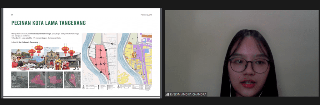 Three UMN architecture students are invited to present their final assignments. They are Geo Bramanta Rahman (Application of Adaptable and Flexible Architecture in the Old Cinere Ruko Area), Timoteus Evelyn Andifa Chandra (Market Design in Tangerang’s Old Town Chinatown with an Urban Catalyst Approach), and Adrian Hannyanto (Design of and Requalification of Tangerang’s Eight Alam Sutera Market as a Healthy Market according to the 2020 Minister of Health Regulation). They are architecture students known to have graduated and chosen to be examples and present their work for this external review.