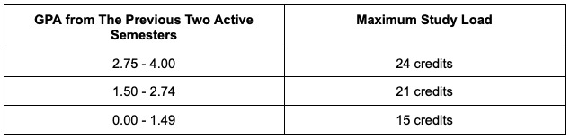 *Taking courses for odd semesters (Semester 3, 5, 7, and on) depends on the previous odd semesters GPA. For instance, the first semester GPA is 3.5 means the maximum study load to be taken in the third semester is up to 24 credits. Then, the third semester GPA is 2.70 means the maximum credits for the fifth semester is up to 21 credits.