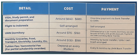 | UMN Dormitory | Around $115 - $160 | Estimated price is per month, Dormitory can also be paid annually with an 8% discount. Payment via UMN Dormitory Bank Transfer |