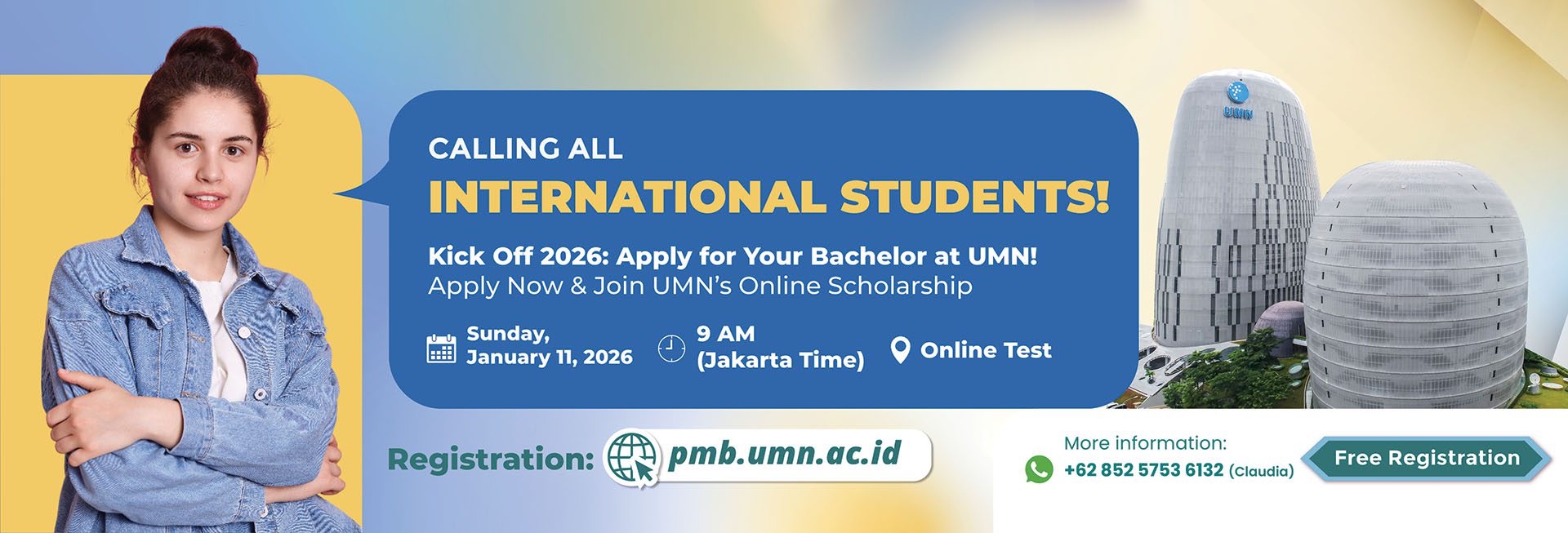 Universitas Multimedia Nusantara (UMN) welcomes international students to apply for our undergraduate or bachelor degree for four years of study. UMN aims to guide and create internationally-minded graduates highly competent in their field, equipped with an entrepreneurial spirit and noble character. We wish to be a part of the change in making our world a better place through our education.