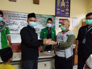 Penyerahan santunan oleh Indiwan Seto Wahjuwibowo selaku Kepala Pengabdian Kepada Masyarakat LPPM UMN kepada Hambali selaku Bendahara GP Ansor Kecamatan Pagedangan (dok. UMN)