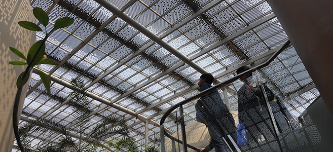 “One of the passive design models used is double skin technology. The use of aluminum perforated material designed with certain patterns of double skin is able to reduce direct sun heat, and provide optimal lighting to the classrooms in it. Thus without the addition of lights, the room is bright enough and comfortable to read,” explained Andrey.
