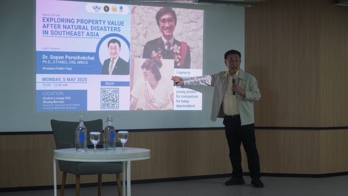 TANGERANG – On Monday (5/05/2025), Universitas Multimedia Nusantara’s (UMN) Architect Professional Education (Program Studi Profesi Arsitektur/PPAR) conducted a public lecture discussing exploring property value after natural disasters in Southeast Asia. The public lecture invited Dr. Sopon Pornchokchai, Ph.D., D.FIABCI, CRS, MRICS, the President of FIABCI, Thailand.