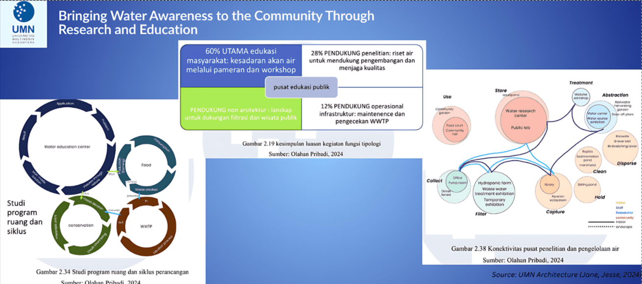 Tangerang – In response to the urgent issue of water pollution in Jakarta’s Pluit Reservoir, students from Universitas Multimedia Nusantara (UMN) designed a regenerative Water Research and Education Center aimed at restoring not only the environment, but also public awareness around responsible water usage. Once a natural swamp and water catchment area, the reservoir has faced heavy ecological degradation due to unfiltered sewage discharge and unplanned urban development. The proposed center integrates ecosystem restoration, sustainable infrastructure, and community education into one functional space, encouraging the public to rethink their relationship with water in urban environments.