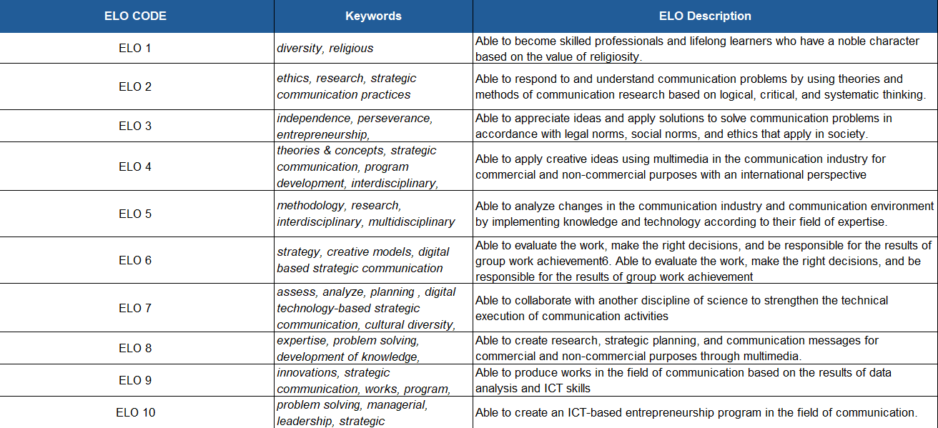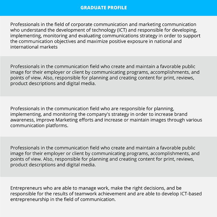 To become a leading undergraduate Communication Science study program that produces graduates with a global outlook, competent in the fields of corporate communication and marketing communication, grounded in logic, ethics, and information and communication technology (ICT). The program emphasizes both theoretical mastery and practical skills, fosters an entrepreneurial spirit, and cultivates graduates with strong moral character.