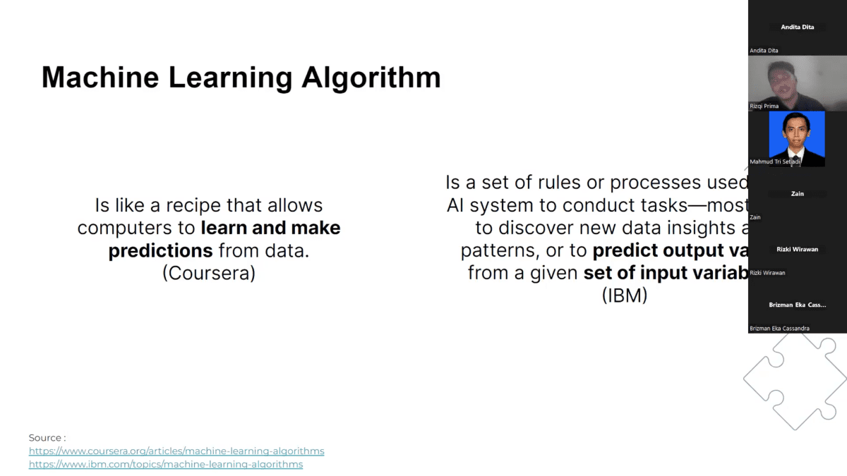 On this occasion, Rizqi also discussed algorithms and essential aspects of Machine Learning and explained them with a very easy-to-understand parable. Rizqi explained the algorithm as a secret recipe that can drive a computer to learn, process, and analyze data into valuable information based on various patterns from the input given so that it can create a prediction. A common example is weather prediction.