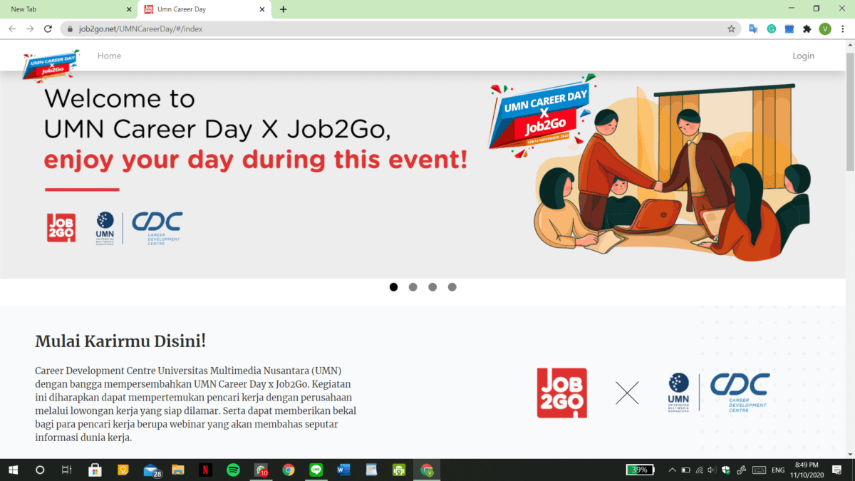 February 26, 2021TANGERANG – Career Development Centre Universitas Multimedia Nusantara (CDC UMN) bekerja sama dengan platform Job2Go mempersembahkan ‘UMN Virtual Career Day X Job2Go 2020’ pada 12 & 13 November 2020. Diharapkan kegiatan ini dapat mempertemukan para pencari kerja dengan perusahaan melalui lowongan kerja yang siap dilamar. Tak hanya lowongan kerja, acara ini juga menggelar beberapa Webinar yang membahas informasi seputar dunia kerja.