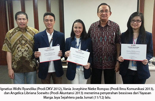 Last Friday (11/12), three UMN students attended the scholarship submission from Yayasan Marga Jaya Sejahtera at Gedung Jaya, Jl.M.H. Thamrin, Central Jakarta. They are Ignatius Widhi Ryandika (DKV 2012 Study Program), Vania Josephine Nieke Rompas (Communication Science Study Program 2013), and Angelica Libriana Soewito (Accounting Study Program 2013). The scholarship submission was carried out directly by Mr. Edmund Sutisna as Chairman of Marga Jaya Sejahtera Foundation.