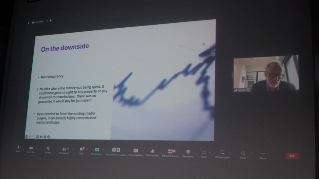 Andrew shared that alternatives to the code in Australia are discussed but not proposed, like a “public interest journalism tax rebate,” where the government will provide a tax rebate for the media to employ journalists if they can demonstrate they are doing public interest journalism.