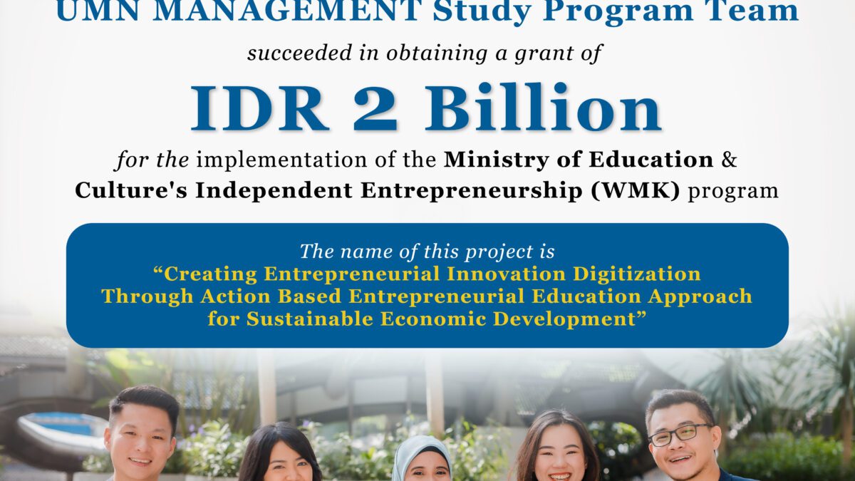 TANGERANG – The Management Study Program team at Multimedia Nusantara University (UMN) managed to get a grant of 2 billion Rupiah for the implementation of the Ministry of Research and Technology’s Wirausaha Merdeka (Wirausaha Merdeka Kemendikbud Ristek/WMK) program. The UMN program is themed “Creating Digitalization of Entrepreneurial Innovation through Action Based Entrepreneurial Education Approach for Sustainable Economic Development.” The project announcement was made on Wednesday (14/6/2023).