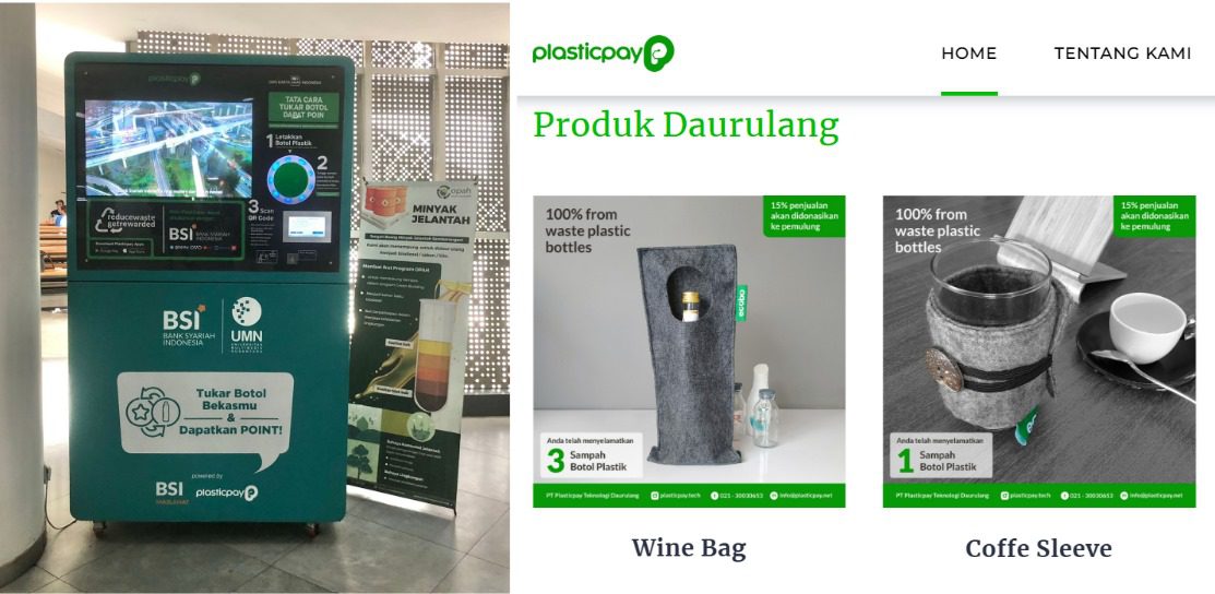 Plasticpay bottle collection machine and their final product (Doc. UMN and Plastic Pay)