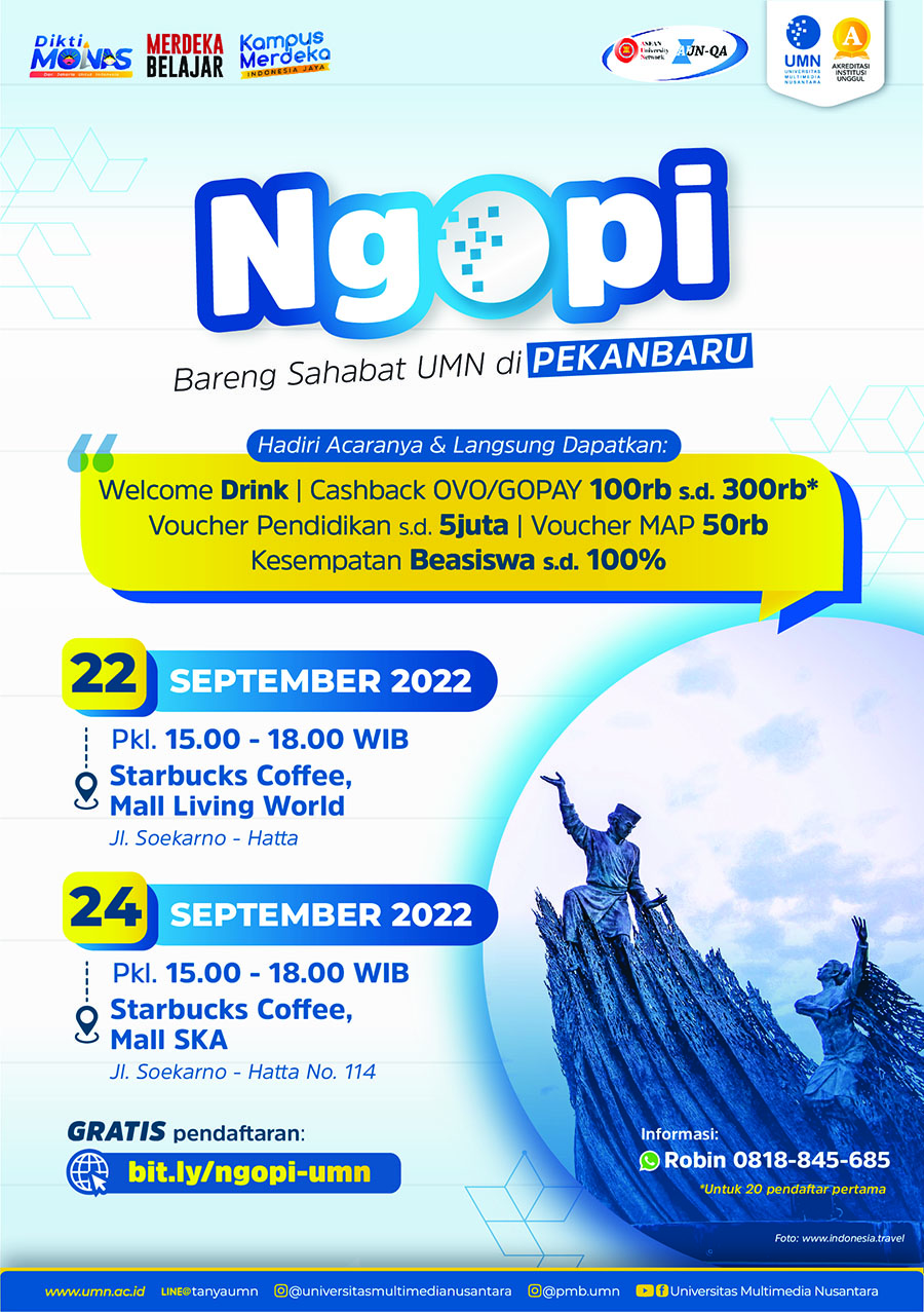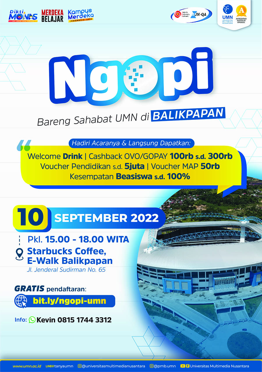 UMN akan mengadakan ngopi bareng Sahabat UMN dan tes beasiswa buat kamu yang tinggal di Balikpapan lho๐ Acara ini khusus untuk kamu yang ingin berkuliah di UMN di Tahun Akademik 2023/2024.