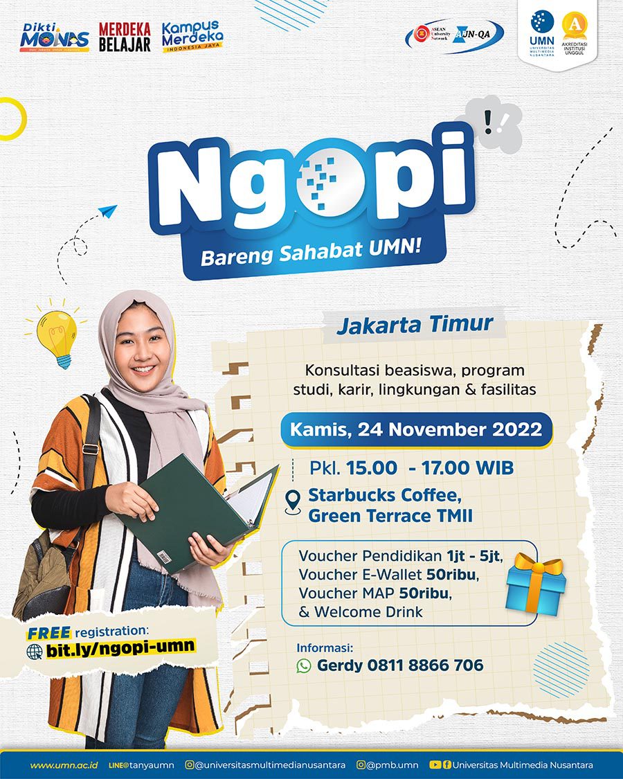 UMN akan mengadakan ngopi bareng Sahabat UMN dan tes beasiswa buat kamu yang tinggal di Jakarta Timur lhoπ Acara ini khusus untuk kamu yang ingin berkuliah di UMN di Tahun Akademik 2023/2024.