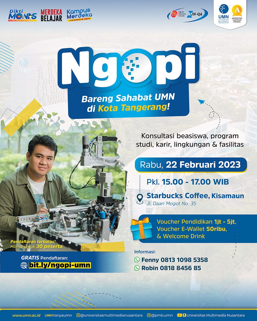 UMN akan mengadakan ngopi bareng Sahabat UMN dan tes beasiswa buat kamu yang tinggal di Kota Tangerang lhoπŸ˜† Acara ini khusus untuk kamu yang ingin berkuliah di UMN di Tahun Akademik 2023/2024.