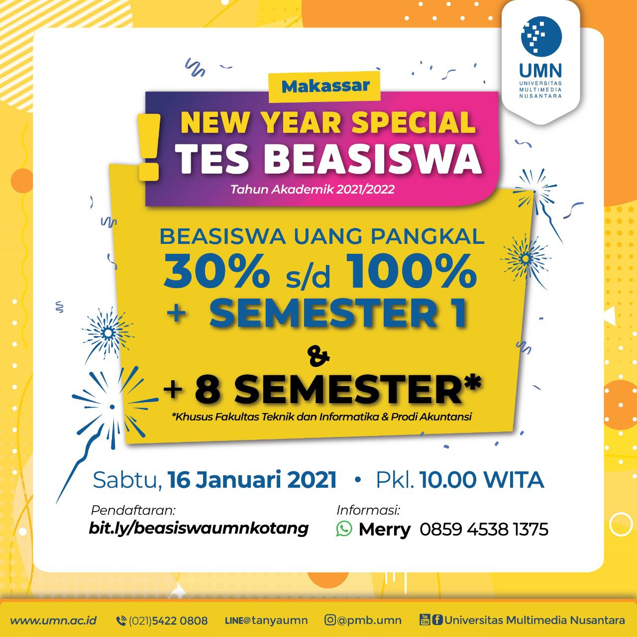Khusus buat kalian yang sekolah di daerah Makassar! UMN mau adain Tes Beasiswa Makassar nih! Kamu bisa dapat beasiswa minimal dapat 30% dari Uang Pangkal lho! 💫