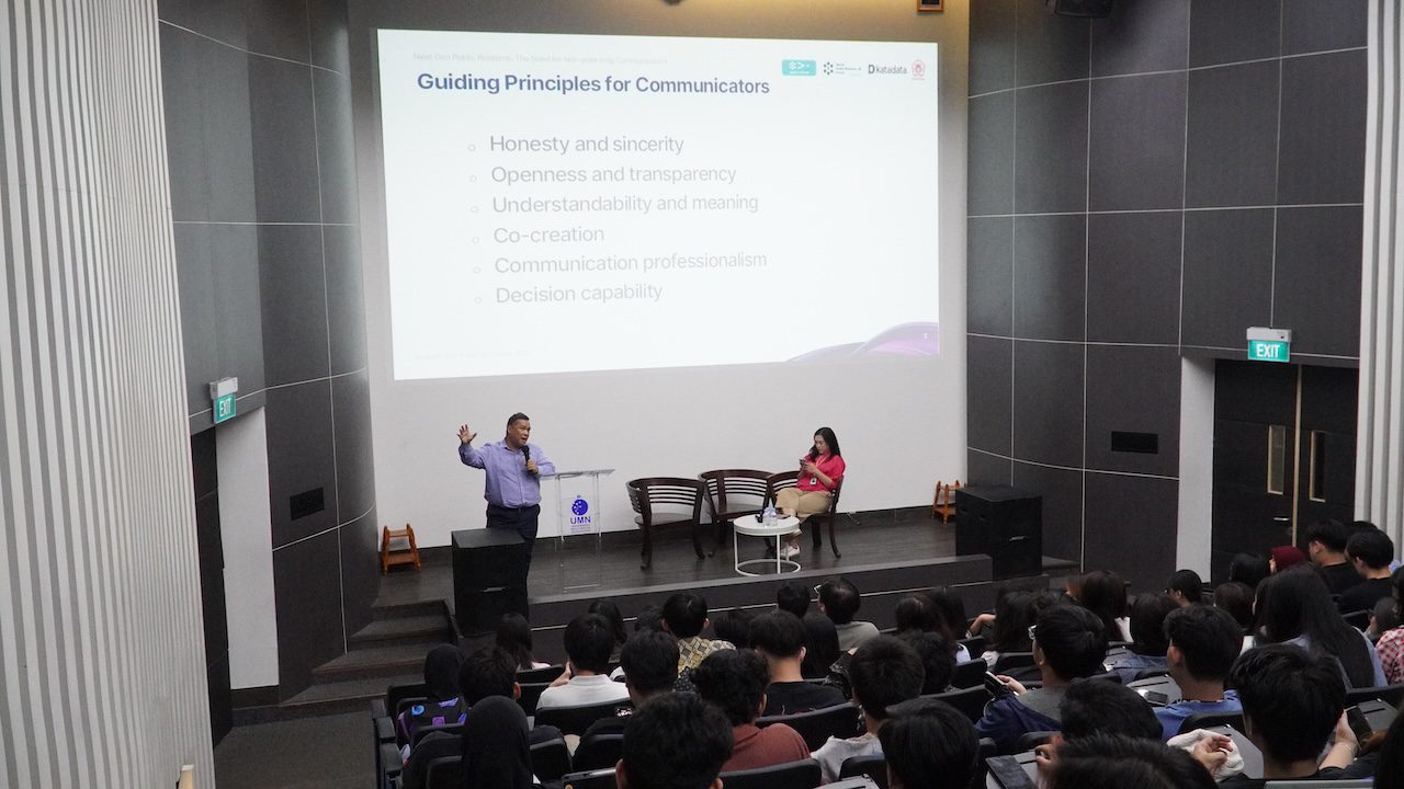 Jude dalam kuliah tamu membahas tentang komunikasi, polarisasi, dan media (Dok. UMN)
