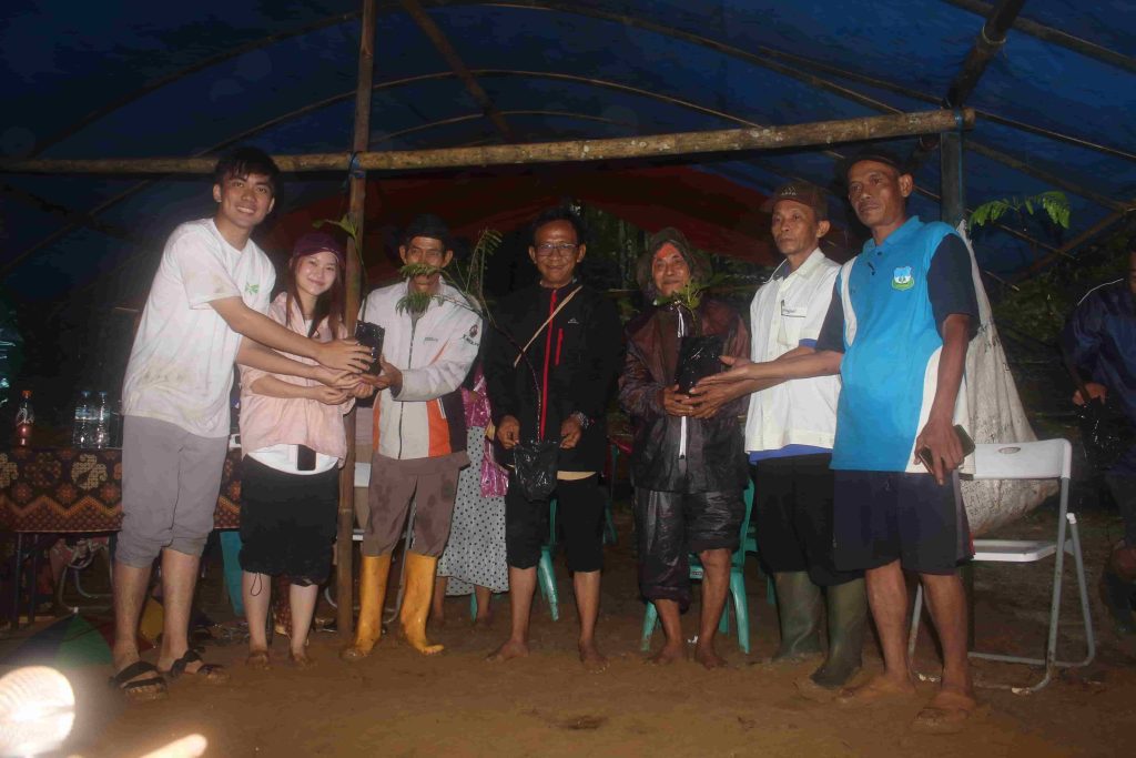 Anis Faisal Reza, Ketua Gugus Mitigasi Lebak Selatan (GMLS), bersama perwakilan mahasiswa UMN secara simbolis memberikan tanaman buah ke warga. (DOK.KIJI)