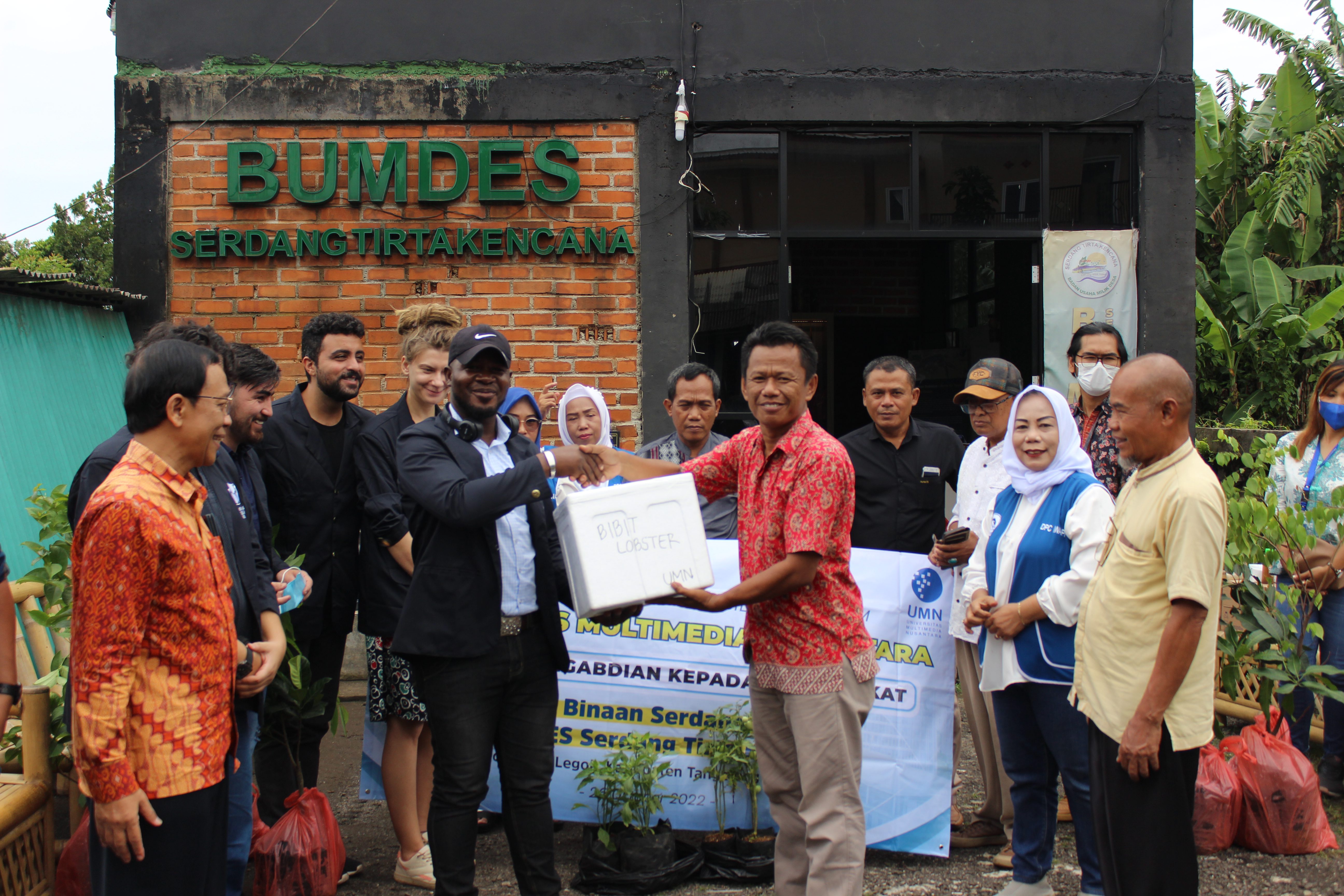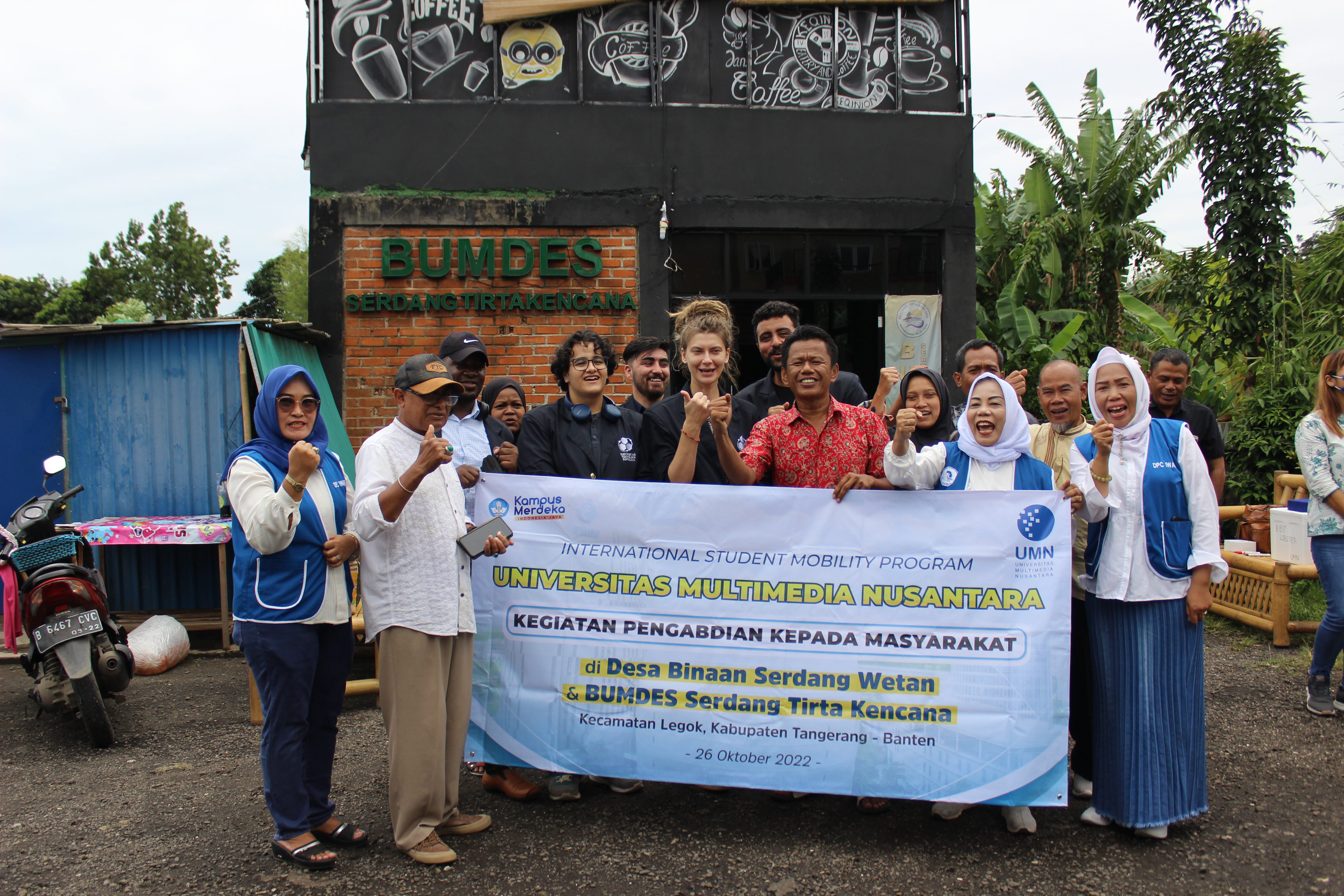 TANGERANG – Global Relations & Cooperations Office (Global Office) bersama Lembaga Penelitian dan Pengabdian Masyarakat (LPPM) Universitas Multimedia Nusantara menyelenggarakan kegiatan Pengabdian Kepada Masyarakat ke Desa Serdang Wetan pada Rabu 26 Oktober 2022, yang melibatkan lima mahasiswa asing dari Universitas Teknologi Sumbawa (UTS) yang mengikuti program student mobility di UMN. Kelima mahasiswa asing tersebut yaitu Aliaksandra Klintsevich, Ahmed Mohammed Yahya Al-Awami, David Tamba Ndomaina, Shafie Noubakht, dan Irfan Khan. Kegiatan ini mengundang Kepala Desa Serdang Wetan Bapak Dodi Munanto, Direktur Badan Usaha Milik Desa (BUMDes) Serdang Tirta Kencana Bapak Wibowo Budi Utomo, Direktur LPPM UMN Dr. Ir. P.M. Winarno, serta Kepala Biro Pengabdian Kepada Masyarakat UMN Bapak Andy Firmansyah. Tidak hanya itu, kegiatan ini juga dihadiri oleh Ketua IWAPI (Ikatan Wanita Pengusaha Indonesia) sekaligus Penasehat BUMDes Ibu Indah, Ketua BPD (Badan Permusyawaratan Desa) Bapak Haji Alex, Ketua LPM (Lembaga Pemberdayaan Masyarakat) Bapak Sultoni, Ketua Karang Taruna Desa Serdang Wetan Bapak Saaman, serta para pelaku UMKM.