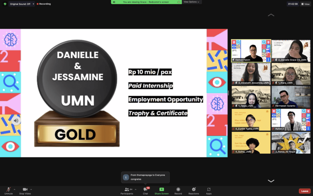 Melalui kemenangan ini, dua tim mahasiswa DKV UMN yang mendapatkan “Gold Winner” dan “Bronze Winner” mendapatkan uang tunai dan berkesempatan magang di RedComm Indonesia. Menurut Grace selaku perwakilan tim yang meraih “Gold Winner”, beberapa tips kemenangan dari lomba ini dapat terdiri dari riset yang mendalam, manajemen tim, dan manajemen waktu yang baik. Lalu, juga ada Tasya sebagai perwakilan tim yang meraih “Bronze Winner” turut mengatakan bahwa kepercayaan diri juga dapat menjadi salah satu kuncinya.