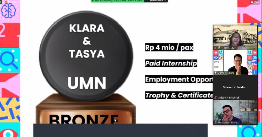 TANGERANG – Dari total puluhan tim peserta lomba, tiga tim mahasiswa Program Studi Desain Komunikasi Visual UMN berhasil menembus lima besar dalam ajang kompetisi nasional “Jawara Muda 2021”. Tidak hanya itu, dua dari tiga tim mahasiswa DKV UMN itu pun diumumkan berhasil menyabet “Gold Winner” dan “Bronze Winner” pada Jumat (22/10/21) dari lomba yang digelar oleh agensi pemasaran digital RedComm ini.