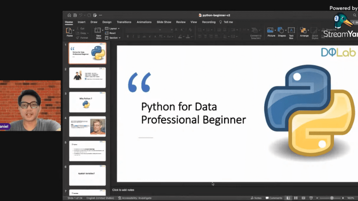 Setelah memperkenalkan dan menjelaskan Python, Daniel juga menjelaskan lebih dalam kegunaan Variabel, mengenal Assign, menjelaskan Tipe Data dalam Python, Operator Matematika, Collections & Index pada Collection dalam Python yang dimana sangat penting sebelum melakukan sebuah programing.