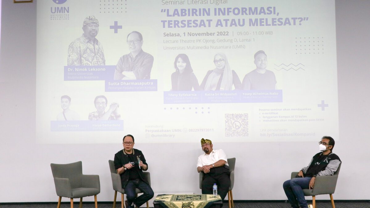 TANGERANG – Berangkat dari permasalahan lonjakan arus informasi saat ini dan menentukan sumber informasi yang valid, akurat, dan reliabel. Universitas Multimedia Nusantara (UMN) Library bersama Kompas mengadakan seminar yang membahas tentang “Literasi Digital: Labirin Informasi, Tersesat atau Melesat?”. Acara ini diadakan langsung di Lecture Theater, P.K. Ojong gedung D kampus UMN, pada Selasa (1/11/2022).