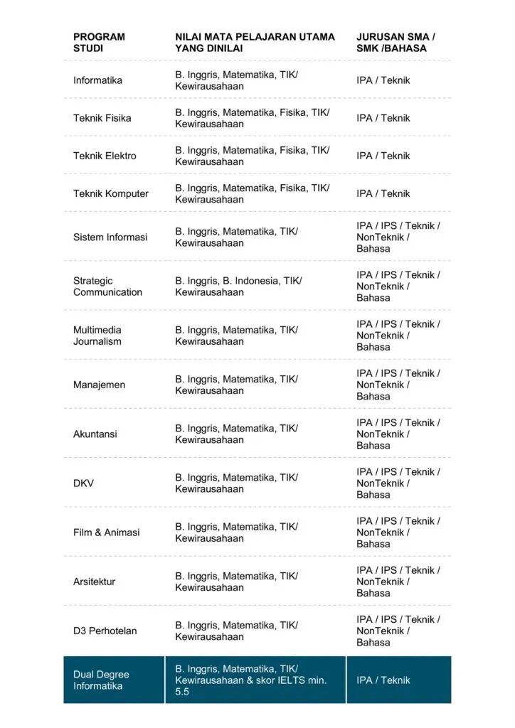 - Lulusan SMK Jurusan TI/Multimedia dapat mendaftar ke Program Studi Informatika, Arsitektur, Teknik Elektro, Teknik Fisika, dan DKV.