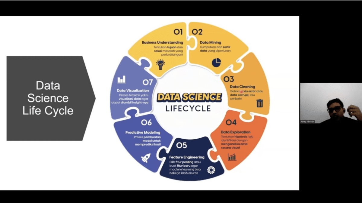 Untuk memudahkan para peserta yang sebagian besar adalah pemula, Ronny membedah tahap-tahap penting dalam siklus kehidupan data science (data science life-cycle), yang menurutnya adalah fondasi bagi siapa pun yang ingin berkarier di bidang ini. Tahapan tersebut meliputi: