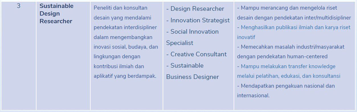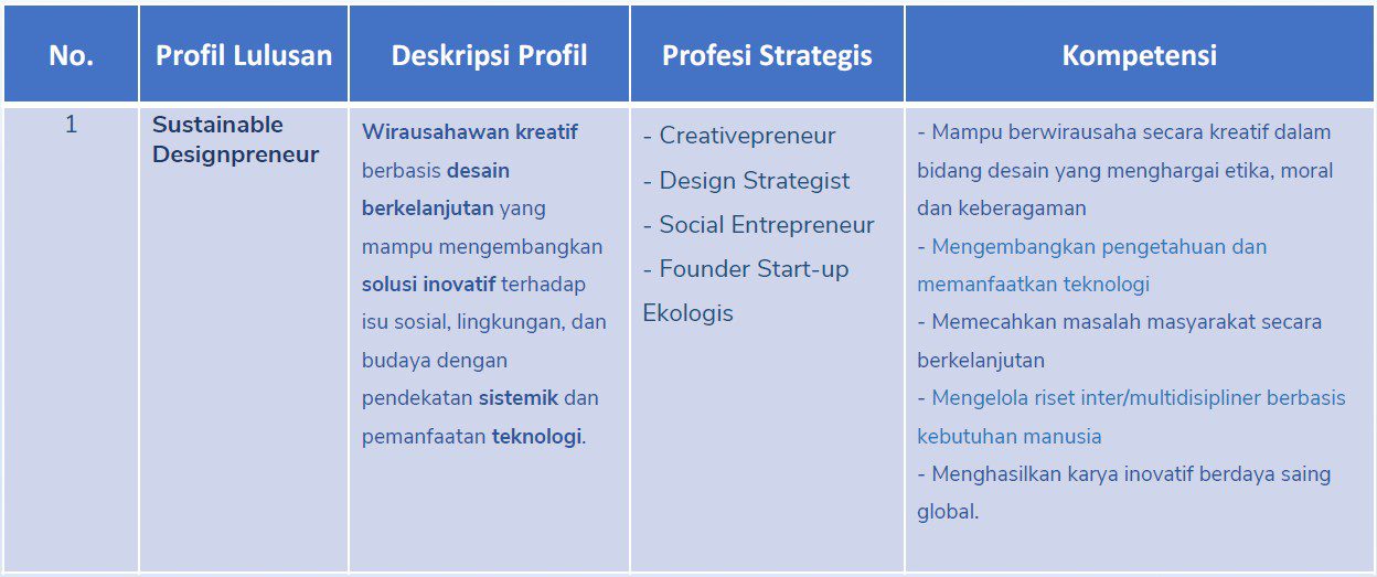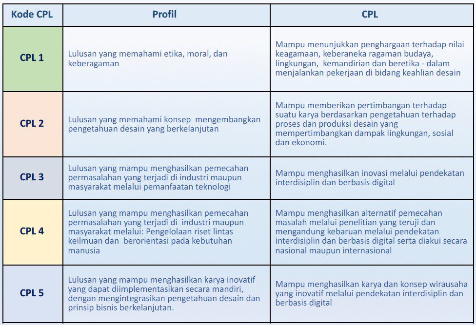 - Menyelenggarakan proses pembelajaran yang berfokus pada desain berkelanjutan yang didukung tenaga pengajar berkualitas dan kurikulum terkini yang mengikuti perkembangan dunia industri.